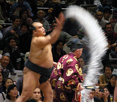 מתאבק סומו זורק לאוויר חופן של מלח, כחלק מטקס ארוך ומורכב לפני הקרב