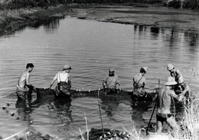 חברי קיבוץ חולתה דגים באגם החולה, 1945. לפני ייבושו, האגם סיפק פרנסה לתושבי האזור, יהודים וערבים | המרכז לתיעוד הגליל העליון, פיקיוויקי