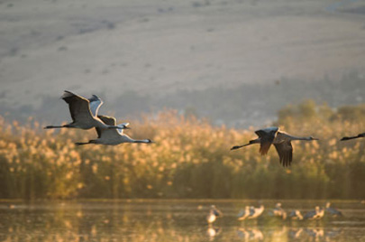 עגורים במעוף מעל האגמון. הפכו לסמלו של המקום | צילום: עמית ארז