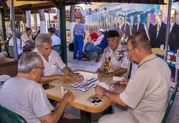 קפיצה קטנה לקובה בהוואנה הקטנה של מיאמיהשכונהשמדרום-מערב לדאון טאון היא ביתם של מהגרים קובנים רבים. את האווירה הקובנית במיטבה ניתן לחוש ברחוב Calle Ocho, עם חנויות סיגרים, מסעדות קובניות ומוזיקה לטינית שמתנגנת בכל מקום. גם פארק מקסימו לופז (Maximo Lopez) שבשכונה מאפשר להרגיש כמו קפיצה קטנה לקובה, והוא גדוש בקשישים קובנים שמשחקים דומינו. .jpg) גברים משחקים דומינו בהוואנה הקטנה לראות משחק באמריקן איירליינס ארנה