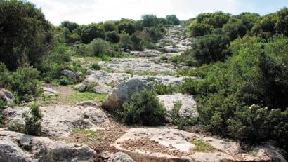מאפסים מד מרחק ופונים לשביל הכבוש ולאחר מאתיים מטר ממשיכים ישר לתוך השביל הצר. לאחר 500 מטר (מצטבר) מגיעים לצומת שבו פונים שמאלה (מערבה) ויורדים קילומטר אחד (מצטבר) עם צומת T (נ"צ 141685/1118853). מאפסים מד מרחק, פונים שמאלה ומטפסים 1.3 קילומטר עד לצומת גדול על רמת אבישור (נ"צ 142729/1118364). מאפסים מד מרחק, פונים ימינה, חוצים מעבר בקר ונוסעים על שביל המסומן בסימון כפול: בירוק ובסימון שביל ישראל. לאחר 1.6 קילומטר מגיעים לצומת שבו פונים ימינה עם השלט לבית גוברין וחרבת צורה. לאחר 1.7 קילומטר (מצטבר) עוצרים כשמשמאל (מדרום) נראית חרבת צורה (נ"צ 142128/1117218). בחרבת צורה נראה שרידי מבנים מהתקופה העות'מאנית, הבנויים על שרידים מהתקופה הביזנטית. על משקוף הכניסה הצפונית אפשר להבחין (בקושי רב) בשרידי חציבה של מנורת שבעת הקנים. גם כאן יש תצפית מקסימה למישור החוף. בימים בהירים אפשר לראות את הארובות של אשדוד. מאפסים מד מרחק וממשיכים על השביל הכבוש ולאחר 1.2 קילומטר נפרדים מסימון השבילים הירוק (הממשיך שמאלה) וממשיכים ישר על השביל הראשי. לאחר 1.6 קילומטר (מצטבר) נגיע לצומת שבו השביל הראשי מתעקל מטה (נ"צ 141879/1116145). מאפסים מד מרחק, פונים ימינה ויורדים למטה עם השביל 1.9 קילומטר עד שמגיעים לצומת T (נ"צ 140482/1116148). מאפסים מד מרחק ופונים שמאלה לכיוון דרום ולאחר מאתיים מטר לצומת המתפצל לשני שבילים. ממשיכים על המזלג השמאלי המטפס מעלה. לאחר 2.1 קילומטרים (מצטבר) מגיעים לשני שערי בקר מברזל. פותחים את השער השמאלי (ומקפידים לסגור אותו היטב) ונוסעים לאורך גדר בצד שמאל התוחמת את תל גודד. לאחר שלושה קילומטרים מגיעים למעבר עמודים בגדר. מחנים את הרכב (נ"צ 141953/1115162) ומטפסים ברגל כמאה מטר (שליש הגובה מפסגת התל) לכוכים הלבנים שמאחוריהם מסתתרות הכניסות למחילות ולמערות של תל גודד. תל גודד מזוהה עם גת, עיר הולדתו של הנביא מיכה (מיכה א' א') ואחת הערים שכבש סנחריב. בחפירות במקום התגלו 37 ידיות מוטבעות בחותם "לַמֶּלֶךְ", שזמנן במאה השמינית לפני הספירה, ומתחם צבאי מהתקופה הרומית, כנראה מימי הורדוס. המערות שבמדרון המזרחי ובדרומו נחפרו כמערכת של מחילות מסתור, כנראה בימי מרד בר כוכבא. הזחילה במחילות מחייבת פנסים ולא מומלצת לקלאוסטרופובים, למרות שהמורדים דאגו לחצוב פתחי אוורור במנהרות. אחרי הזחילה מאפסים מד מרחק וחוזרים בנסיעה לאורך הגדר 350 מטר. פונים שמאלה בשביל הראשון, נוסעים כמאה מטר עד למעבר בקר ומגיעים לכביש 38 (נ"צ 141758/1114839), שם נמצאת נקודת סיום המסלול. |