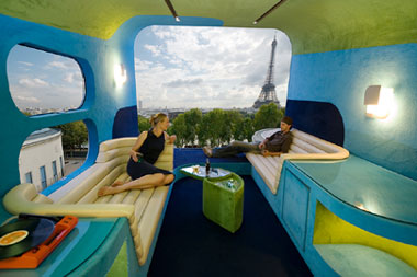 חדר ירוק ניצב על גג המוזיאון לאמנות מודרנית "פאלה דה טוקיו" ברובע ה-16 בפריז. ברוכים הבאים למלון EVERLAND. אפשר לבקר בחדרו היחיד של המלון במשך היום. אפשר גם לישון בו בלילה, אם תזדרזו להזמין מקום. זה כדאי מאוד אם אתם אוהבים את שנות השבעים פורסם 17.10.08 |