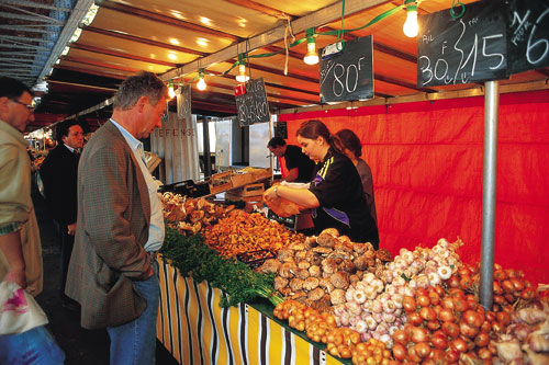 קטן ובגט קצר לארוחה קלה, מתחככות עם דיפלומט יפני, שבודק בקפדנות זימים של דג טרי. בשוק זה אפשר למצוא גם אוכל מוכן או מוכן לבישול: שוּקרוּט מאלזס, פּאֶייה מחבל הבסקים או קונפי של ברווז מהדוֹרדוֹן (Dordogne). בצידו השני של נהר סן מתכון לאוהבים המוכר יחצה לך את הכיכר בשמחה, ועם הלחם, שפיו הפעור מצפה לאוכל כגוזל של ציפור, תיגש חיש מהר לדוכן של בשר – השרקוּטֶרי. שם אפשר