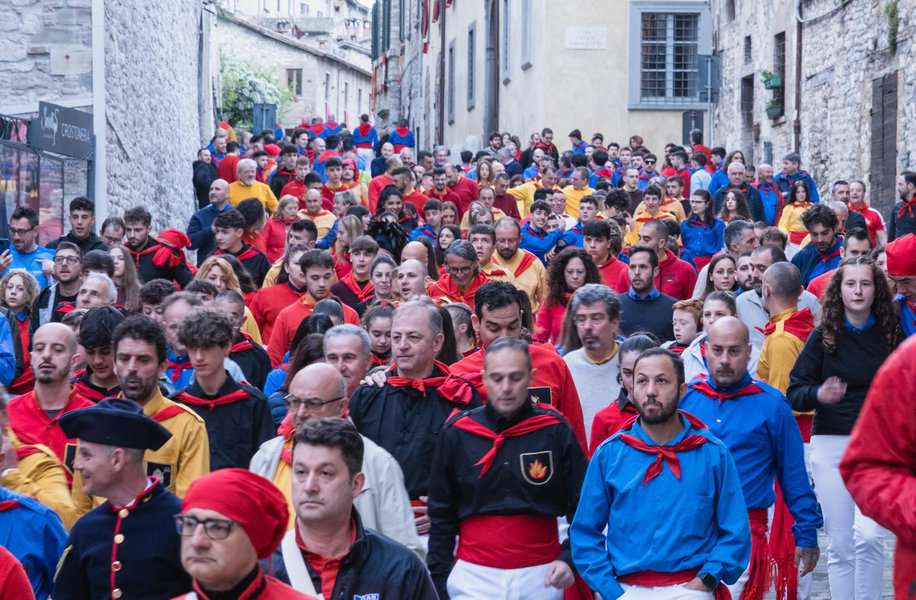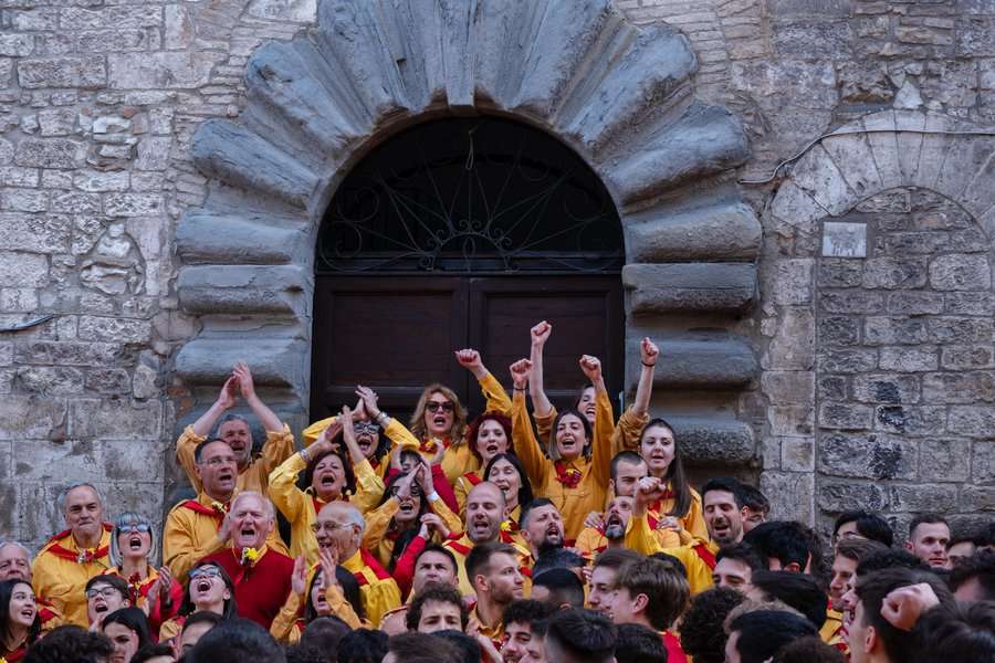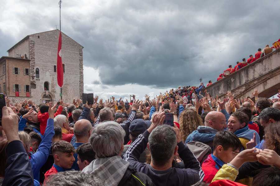 התלהבות ושמחה ושירה שפרצה מקבוצת סנט אובלדו. כשעה נצבתי לצידם, מכושף, כשאלו שרו וחגגו. הקבוצה בצהוב הייתה הבולטת מבין הקבוצות בשמחה ובשירה. כד צבעוני נישא על ידי אחד המשתתפים. גוביו ידועה בעבודת הקרמיקה שלה