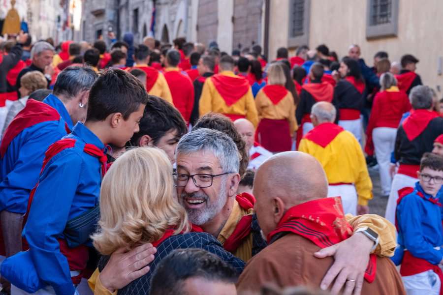 לבוש המשתתפים של שלוש הקבוצות בלט בגוונים עזים, מכנסיים לבנים, חולצות בצבע צהוב לקבוצת סנט אובלדו, כחול לקבוצת סן ג'ורג'יו ושחור לסנט אנטוניו. מה שבלט יותר מכל היה האבנט שהוא בד אדום באורך של כשלושה מטר, והיה מרתק לצפות בלבישתו סביב המותניים. הקבוצות מתקבצות סביב עיסוקם ומסורת משפחתית. הם מוערכים בכ-400 משתתפים פעילים לכל קבוצה. בפועל מספרם גדול בהרבה.
