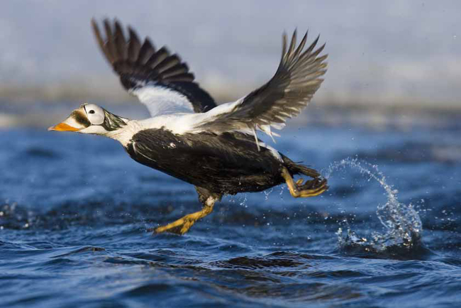 הברווז השחור-לבן אץ לו רץ לו על גבי המים, בעודו מנופף בעוז בכנפיו ומתיז לכל עבר, ונזקק לכמה וכמה מטרים כדי להתרומם לאוויר. הצלם הנורווגי שטיג פרוד אולסן הנציח את רגע ההמראה, באגם בצפון אלסקה. ברווזים שחורים-לבנים מצויים בעיקר בשלושה אזורי חוף באלסקה וברוסיה. הם חורפים בים ברינג.