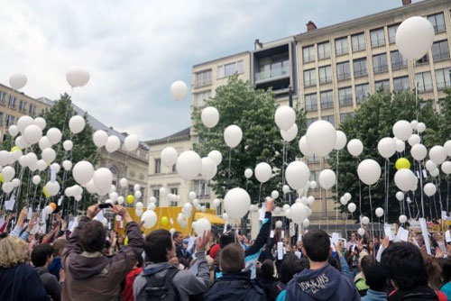 תלמידי בית ספר בעיר הבלגית גנט צעדו ברחובות והפריחו בלונים לבנים כמסר נגד גזענות ואלימות פורסם 27.5.14 |