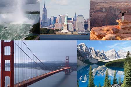 נתונים כלליים צפון אמריקה (אמריקה הצפונית) היא היבשת השלישית בגודלה בעולם ורביעית במספר תושביה. בשטחה נמצאות קנדה (המדינה השנייה בגדולה בעולם), ארצות הברית (המדינה השלישית בגודלה בעולם) ומקסיקו. בשלושת המדינות חיים כ-448 מיליון תושבים. צורתה של צפון אמריקה דמוית משולש הפוך, רחב בצפון וצר בדרום. שטחה, לרבות האי גרנלנד (השייך מבחינה מדינית לאירופה), הוא 21,586,311 קילומטרים רבועים. מקובל לכנות את קנדה וארצות הברית אנגלו-אמריקה ואת מקסיקו לכלול עם מדינות מרכז אמריקה ולכנותן אמריקה הלטינית. גיאוגרפיה צפון אמריקה מוקפת באוקיינוס הארקטי מצפון, באוקיינוס האטלנטי ממזרח ובאוקיינוס השקט ממערב. בדרומה נמצא מפרץ מקסיקו. מיצר טוונטפק (Tehuantepec), שרוחבו 60 קילומטר בלבד, נחשב גבולה הדרומי. על רוב שטחה משתרעות קנדה וארצות הברית. מבחינה גיאוגרפית, כוללת אמריקה הצפונית גם את מקסיקו, שמבחינה תרבותית שייכת למדינות אמריקה הלטינית. רכסי הרים גבוהים נמשכים מצפון לדרום במערב היבשת, לא הרחק מהאוקיינוס השקט. לאורך החוף המערבי של ארצות הברית וקנדה נמתחת רצועת הרים (הרי החוף). ממזרח להם נמתחים הרי הרוקי שמגיעים עד גובה של 4,000 מטר. רכסי הרים נמוכים וקצרים יותר נמשכים מצפון לדרום בחוף המזרחי (רכס האפלצ'ים). ממערב לרכס האפלצ'ים נמצאים האגמים הגדולים, המהווים יחד את מקווה המים המתוקים הגדול בעולם. במרכז היבשת משתרעים מישורים רחבי ידיים, שבשטחם נמצאות כמה מהימות בעולם. הנקודה הגבוהה ביותר באמריקה הצפונית היא פסגת הר מקינלי שבאלסקה, בגובה 6,194 מטר. הנקודה הנמוכה ביותר היא עמק המוות שבקליפורניה, בגובה 86 מטר מתחת לפני הים. אוצרות טבע: בארצות הברית יש נפט, פחם, נחושת, עופרת, אורניום, אשלגן, אבץ, ברזל, כספית, זהב, כסף, ניקל וגז טבעי. בקנדה יש מאגרים אדירים של אוצרות טבע, והיא עשירה בנפט, בגז טבעי, בנחושת, בניקל, בעופרת, באבץ, בפחם, בכסף, בברזל, במגנזיום ועוד. מקסיקו עשירה גם היא בנפט, בפחם ובגז טבעי, וגם בכסף, (היא היצרנית הגדולה בעולם בענף זה), באבץ, בכספית, בארסן, בזהב, בברזל, בנחושת ועוד. אקלים האקלים באמריקה הצפונית מגוון מאוד שכן היבשת נמתחת מצפון לדרום וחוצה כמה אזורי אקלים. מקובל לחלק את האקלים באמריקה הצפונית לחמישה חלקים: שני שליש הצפוניים ביבשת – אלסקה וקנדה (וגם גרנלנד) – מאופיינים באקלים סובארקטי וארקטי, מה שאומר חורפים ארוכים, חשוכים ומושלגים; שני שליש ממזרח ארצות הברית ודרום קנדה מאופיינים בלחות ובחלוקה ברורה לארבע עונות השנה; החלק המרכז-מערבי של ארצות הברית וצפון מקסיקו ההרריים מאופיינים במזג אוויר מדברי וצחיח עם מיעוט משקעים; האזור הצר שנמתח מדרום אלסקה עד לדרום קליפורניה, לאורך האוקיינוס השקט, מאופיין בחורף מתון ובקיץ כמעט חף מגשם, ואילו דרום מקסיקו מאופיין באקלים טרופי. אקלימה של אמריקה הצפונית מגון מאוד, מפני שהיבשת הארוכה נמתחת מחוג הקוטב הצפוני ועד 800 קילומטר מצפון לקו המשווה. מארג אתני משערים שתושביה הראשונים של היבשת, האינדיאנים והאסקימואים, באו מאסיה דרך מצר ברינג. בנדודיהם הגיעו שבטי האינדיאנים עד מקסיקו ומרכז אמריקה ויצרו שם תרבות מפוארת זמן רב לפני שכף רגלו של האדם הלבן דרכה שם. עד שהגיעו המתיישבים מאירופה היתה אוכלוסיית היבשת דלילה מאוד, מפוזרת ומגוונת. המתיישבים האירופאים הראשונים באמריקה הצפונית הגיעו מספרד, שהתיישבו בחופי מפרץ מקסיקו במאה ה-16. אחריהם באו הצרפתים, שהתיישבו על גדות נהר המיסיסיפי ונהר סנט לורנס, והבריטים, שהתיישבו בחוף המזרחי. בעקבותיהם הובאו עבדים שחורים מאפריקה לעבוד בשדות הכותנה בדרום ארצות הברית. מהמאה ה-18 הגיעו לארצות הברית ולקנדה מהגרים מכל אירופה בזרם בלתי פוסק. במאה ה-19 באו גם מהגרים רבים מהמזרח הרחוק, בעיקר מסין ומיפן. ארצות הברית וקנדה מתאפיינות באוכלוסייה הטרוגנית מאוד מכיוון ששתיהן מדינות הגירה מובהקות. האמריקאים והקנדים דומים מאוד באורח חייהם, ויש מעבר אוכל