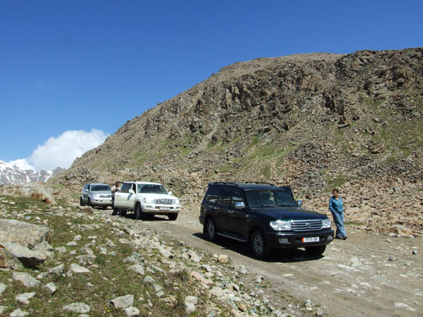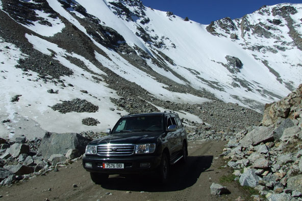 בקניון מדברי צר משלבים ל-4X4 וכך נוהגים עד סוף היום. אחרי הקניון הצר, שדרת ההר הראשית של הרי טיאן-שאן נפתחת במלא הדרה. פסגות משוננות של צוקים וקרחונים מסמנות את היעד, מעבר צר בין הפסגות. דרך העפר המקרטעת מעלה, לאט ובבטחה, לכיוון מעבר ההרים טוסור. בערך כשלוש שעות אחרי היציאה מד הגובה עומד על 3,600 מ', שכבה דקה של שלג ושלוליות קרח קפואות מכסות את נתיב הדרך. כאן למתחיל קטע קצר, מאתגר ומהנה של נהיגת שטח. בקשר ניתנת הוראה לנעול דיפרנציאל ולשמור על מרחק נכון בין הרכבים, הנהגים המיומנים וצמיגי השטח יעשו את העבודה. מי שלא אוחז בהגה יוצא החוצה לאוויר הבהיר והקפוא לצלם ולתת עצות. לאט לאט ובהדרגה שיירת הג'יפים מנתבת באלגנטיות במסלול מכשולים באורך כשלושה קילומטרים של סלע וקרח עד ראש מעבר טוסור, בגובה 3,900 מ'. הנוף, כמובן, עוצר נשימה וכך גם הדרך הארוכה.