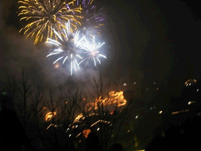 תרועות של שלוש תזמורות ושאגות מצד הקהל ליוו מאות סרטי נייר שהושלכו על העומדים בכיכר. הרטיבות שחשנו מיד לאחר מכן לא באה מגשם פתאומי. זו היתה השמפניה שריססו שכנינו. הדחיפות הגיעו בתוך כמה דקות לגבול הדק שבין שעשוע חביב לאלימות. הקהל בכיכר התחלף: במרכז נותרו הצעירים, שבאו בדיוק בשביל הדחיפות האלה. בשוליים התרכזו המבוגרים יותר, שבאו בעיקר בשביל המסורת והאלכוהול. כולם נראו מרוצים מאוד. רודי והסקסופוניסטית נראו כבר ממש קרובים זה לזה, אם כי כלל לא בטוח שהנגינה על טרומבון, כאשר גברת צעירה יושבת על כתפיו ומנפנפת בידיה כמנצחת על תזמורת פילהרמונית, תפתור לו את כאבי הגב.