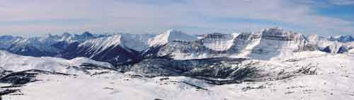 מבט פנורמי על הרי רוקי הקנדיים. שכבות של סלעי משקע שהתקפלו כמו קלפי משחק צילום: קארל נאונדורף
