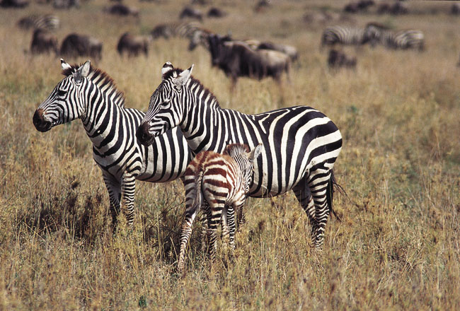 מדוע ולמה לובשת הזברה פיג'מה? לעיתים מזומנות נוטות הזברות להשעין את ראשן, האחת על גב רעותה. זו מחווה ידידותית, שתועלת בצידה: היא מעניקה לצמד תצפית היקפית לצורך התרעה מוקדמת מפני טורפים. ואמנם, הגנה הוא שם המשחק בסרנגטי. בלעדיה אין כל סיכוי לשרוד כאן. היצמדות הזברות לעדרי הגנו גם היא אמצעי הגנה. אריות מעדיפים לטרוף גנו. מן הסתם, בשרם ערב יותר לחיכם, ובציד גנו האריות גם אינם מסתכנים בבעיטה עזה, שעלולה להיות מנת חלקם אם יצודו זברה. כך משמשים עדרי הגנו מעין פוליסת ביטוח לזברות. בעבר האמינו כי גם לדגם הפסים של הזברה תפקיד בהגנה מפני טורפים, בכך שהוא מטשטש את דמותה. לו היתה זו אכן הסיבה לכך שהזברה לובשת פיג'מה, סביר היה כי בסייחים צעירים, שטרם התפתחו בהם מלוא הכישורים הפיזיולוגיים, ועל כן הם חשופים יותר לסכנת הטריפה, יהיה דגם זה בולט יותר. מתברר כי אין זה כך; נהפוך הוא, בסייחים הצעירים הפסים הכהים אינם שחורים אלא חומים, ואילו הרקע אינו לבן אלא בז'. צבעם דומה יותר, איפוא, לצבעם של רוב בעלי החיים בסוואנה, כגון צבי, אימפלה, קודו או איילנד, והוא צבע ההסוואה ההולם לנוף חיותם. הזואולוג הבריטי דזמונד מוריס מפרט באחד מספריו תשע תיאוריות שונות המנסות להתמודד עם חידת דגם הפסים של הזברה. כיום נוטים לחשוב כי הדגם המפוספס נועד להסוות את הזברה מפני זבוב הצה־צה. לזבוב זה יש עיני תשבץ, ולפי הטענה, הדגם המפוספס אינו נראה בהן. הזבוב נושא טפיל העלול לגרום למחלת השינה – אחת המחלות הטרופיות הקשות ביותר, המהווה את אויבן העיקרי של הזברות הבוגרות. אויביהם העיקריים של הזברות הצעירות, לעומת זאת, הם הטורפים למיניהם; וכהגנה מפניהם עדיף צבע הסוואה רגיל ולאו דווקא מפוספס, ואם כבר מפוספס – אז שלא יהיה בולט מדי.