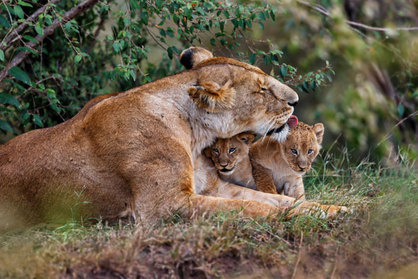מיטב הרפרטואר החתולי אף על פי שניכר בגורים כי לא היו בני אותו גיל וגודל, ינקו כולם מכל אחת משלוש הנקבות. בחלב של כל אחת מהן מצויים נוגדנים שונים, וכך מקבלים הגורים חיסון טוב יותר נגד מחלות צפויות. על פרוותם, ובעיקר על שוקיהם ובטנם, אפשר היה להבחין בסימני נימור הדומים לאלה של הנמרים, אף כי צבעם היה בהיר יותר. מקובל לחשוב כי מוצאה של משפחת החתוליים, שהאריה נמנה עם בניה, הוא ביערות ובסבכים. בנופים אלה חי כל אחד מבני המשפחה לבדו. הדגם המנומר משפר את ההסוואה ביער ובסבך, שבהם מתחלפים כתמי אור בהירים בכתמים מוצללים. בניגוד לבני משפחתם, הסתגלו האריות לחיים בנופיה הפתוחים של הסוואנה, מבעלי חיים יחידאים הם הפכו לחברותיים וגם צבע פרוותם השתנה לבז'־צהבהב אחיד, התואם את רקע הצמחייה היבשה; אך בצעירותם הם כמו שומרים אמונים לדגם המקורי, המרמז על מוצאם.