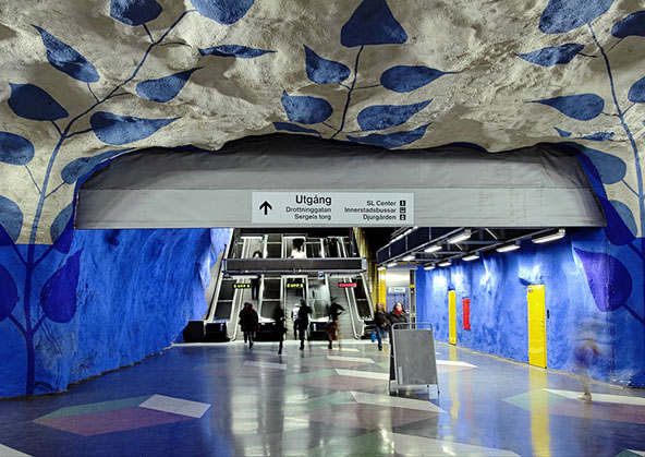 תחנת פורמוסה בקאושיונג, טייוואן עיצוב צבעוני במיוחד מאפיין גם את תחנת שדרת פורמוסה (The Formosa Boulevard Station) בקאושיונג שבטייוואן. התחנה מפורסמת בכיפת הויטראז' שלה, שנחשבת לעבודת הזכוכית הגדולה בעולם. הכיפה, שעוצבה על ידי האמן האיטלקי נרקיסוס קווגליטה, מורכבת מ-4,500 לוחות של זכוכית צבעונית וקוטרה מגיע ל-30 מטר. הכיפה מעוטרת בציורים מרהיבים בשלל צבעים, ולא במקרה רבים בעיר בוחרים להתחתן דווקא כאן.  כיפת האור של תחנת הרכבת פורמוסה בטייוואן, אחת מעבודות הזכוכית הגדולות בעולם ארט א מטייר, פריז תחנת המטרו ארט-א-מטייר (Arts et Metiers) הפריזאית היא תחנה ותיקה, שנפתחה ב-1904. בדיוק 90 שנה מאוחר יותר, ב-1904, התחנה, שנמצאת סמוך למוזיאון האמנויות והמלאכות, זכתה לעיצוב מחודש על ידי אמן הקומיקס הבלגי פרנסואה שויטן, שעיצב אותה כמעין צוללת בסגנון תעשייתי עתידני, בהשראת סיפורי המדע הבדיוני של ז'ול ורן. .jpg) תחנת ארט א מטייר בפריז עוצבה בהשראת ספריו של ז'ול ורן תחנות הרכבת של סטוקהולם, שוודיה השוודים אמנם הביאו לעולם את איקאה, אבל תחנות המטרו שלהם מוכיחות שהעיצוב השוודי יכול להיות לא רק פרקטי אלא גם יצירתי ומלא דמיון. למעשה, תחנות המטרו של סטוקהולם נחשבות לאטרקציה תיירותית לא פחות מהארמון המלכותי או ממוזיאון ואזה. אחת הדוגמאות הטובות לכך היא תחנת רדהוסט (Rådhuset). המעצבים הותירו את הסלע חשוף וכך הנוסעים בתחנה מקבלים את התחושה שהם נמצאים במערה טבעית ולא מתחת לבית המשפט העירוני.  עיצוב מערתי בתחנת הרכבת רדהוסט בסטוקהולם תחנה מעניינת נוספת בסטוקהולם, אף היא בעיצוב מערתי, היא T-Centralen, אחת התחנות הראשיות בעיר. בתחנה זו התקרה נראית כמו סלע הצבוע בכחול ולבן ומעוטר בציורי קיר ענקיים של ענפים. תחנת T-Centralen, שנראית כמו מערה כחולה מעוטרת בציורי ענפים