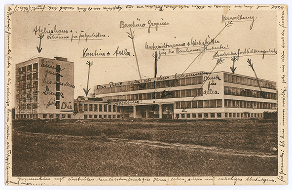 מתוך התערוכה בגלריה הברלינאית: גלויה של בית הספר באוהאוס בדסאו שסטודנט שלח לאמו בשנת 1927 | photo: Lucia Moholy, 1925 – 1926, Bauhaus-Archiv Berlin © VG Bild-Kunst Bonn 2019