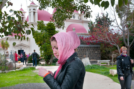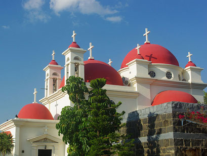 גפנים נותנות צל, טווסים הדורים מהלכים בבוסתן מטופח, כיפות אדומות מעל קירות מסוידים בלבן וברקע הכנרת - כל אלה תורמים לתחושה של התרגשות והתעלות. טיול אל כנסיית 12 השליחים ליד כפר נחום פורסם 10.12.13 |
