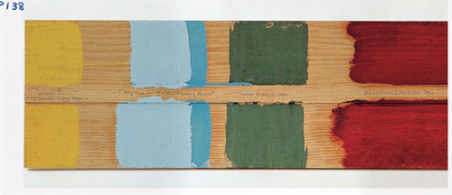 | דוגמת צבעים שנעשתה בימינו על פי "מתכון" שייקרי. בשנים האחרונות גובר העניין הציבורי בשייקרים. הכפרים שנסגרו הפכו למוזיאונים המשחזרים את "גן העדן על פני האדמה" | צילום : חנן ישכר |