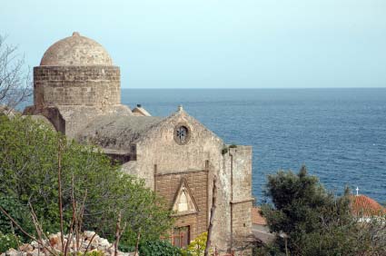 כנסייה עתיקה במונמבאסיה על רקע נופי ים | צילום: Yiannis Veslemes