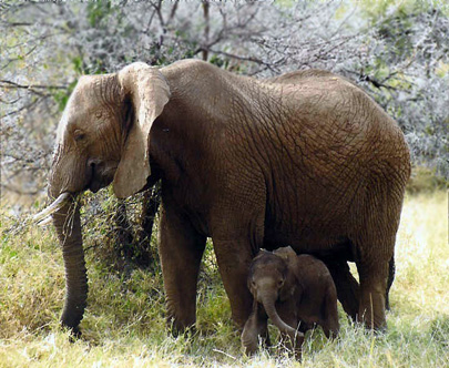 פילה עם גור. בשלושת החודשים הראשונים הפילון לומד לפתח יכולות מוטוריות שונות, בעיקר שימוש בחדק | צילום: Sandra Fenley, GFDL