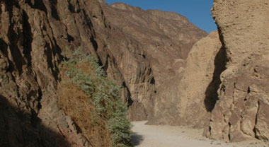 בקטע זה של ערוץ נחל שחורת מתרחשת תופעה מעניינת. הערוץ זונח את הקטע בו הוא זורם דרך סלע הגיר הצהבהב ונכנס אל קטע שבו הוא חוצה סלע גרניט קשה וקהה. השוני ניכר לא רק בצבע הסלעים, אלא גם בצורת הקניון. בסלע הגיר שקשיותו בינונית, נוצר ערוץ רחב יותר מאשר בסלע הגרניט הקשה, שבו נותר מעין קניון קטן. השביל פונה שמאלה במורד הערוץ (השביל מסומן בירוק). תוך דקות נמצא בין מצוקי גרניט כהים וקשים. את רצפת הנחל מכסה שכבה עבה של חלוקי נחל. בגלל גוון הסלע הכהה הוא מתלהט במיוחד בשמש. לא אחת נמדדות כאן בקיץ טמפרטורות קרקע של 80 מעלות. נתון זה עשוי להעלות את מידת ההערכה לצמחים הבודדים שחיים כאן – עצי שיטה שנאחזים בגדות הנחל וצלף סחוסי הפורץ מבין סדקי הסלע. במהלך הצעידה בקניון יש להתגבר על כמה מכשולים קטנים, אולם הדרך בעיקרה פשוטה וקלה. כעבור קילומטר וחצי מגיעים חזרה אל חניית הרכבים. |