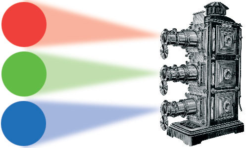 צילום: כל אחת מהתמונות צולמה שלוש פעמים (ברצף מהיר) על גבי שלושה לוחות זכוכית שונים. לפני העדשה בכל צילום הונח פילטר של אחד מהצבעים הבאים: אדום, כחול וירוק.