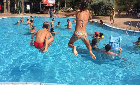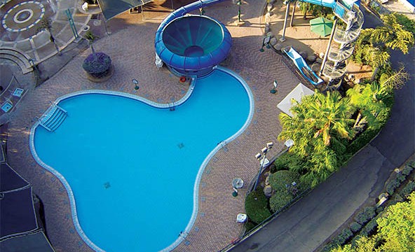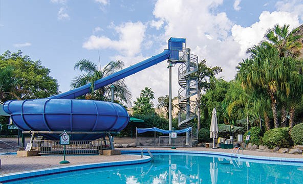 עולם המים: מגלשה ספיראלית לבני עשר ומעלה, בריכת מים בטמפרטורה רגילה, מזרקות מים לקטנטנים.