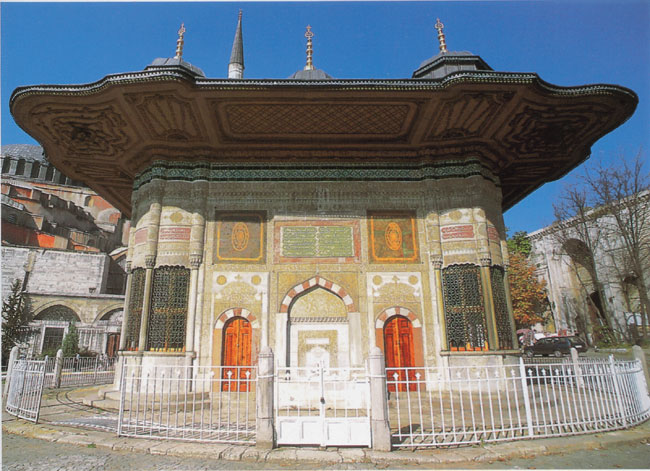 המפורסמת שבהן היא מזרקת המים של הסולטן אחמט השלישי (Sultan III Ahmet Çeşmesi), הניצבת מול שער ארמון טופקאפי (Topkapi). המזרקה הוקמה ב-1728, על חורבות באר ביזנטית. המבנה מרובע, אבל פינותיו מעוגלות ובולטות כלפי חוץ, בניסיון לשקף את התנועה הזורמת. בכל אחד מארבעת הקירות יש שוקת שקועה בתוך גומחה, שלתוכה נשפכים מים מברזים. הקירות מעוטרים בתבליטים של צמחים. האפריז שמעל הקשת מעוטר בכתובת הקדשה מחורזת – קליגרפיה של אותיות זהב על רקע כחול-ירוק – המפארת ומשבחת את הסולטן, ומשווה את טעמם של מי המזרקה למתיקותם של מי הבאר הקדושה זמזם במכה.