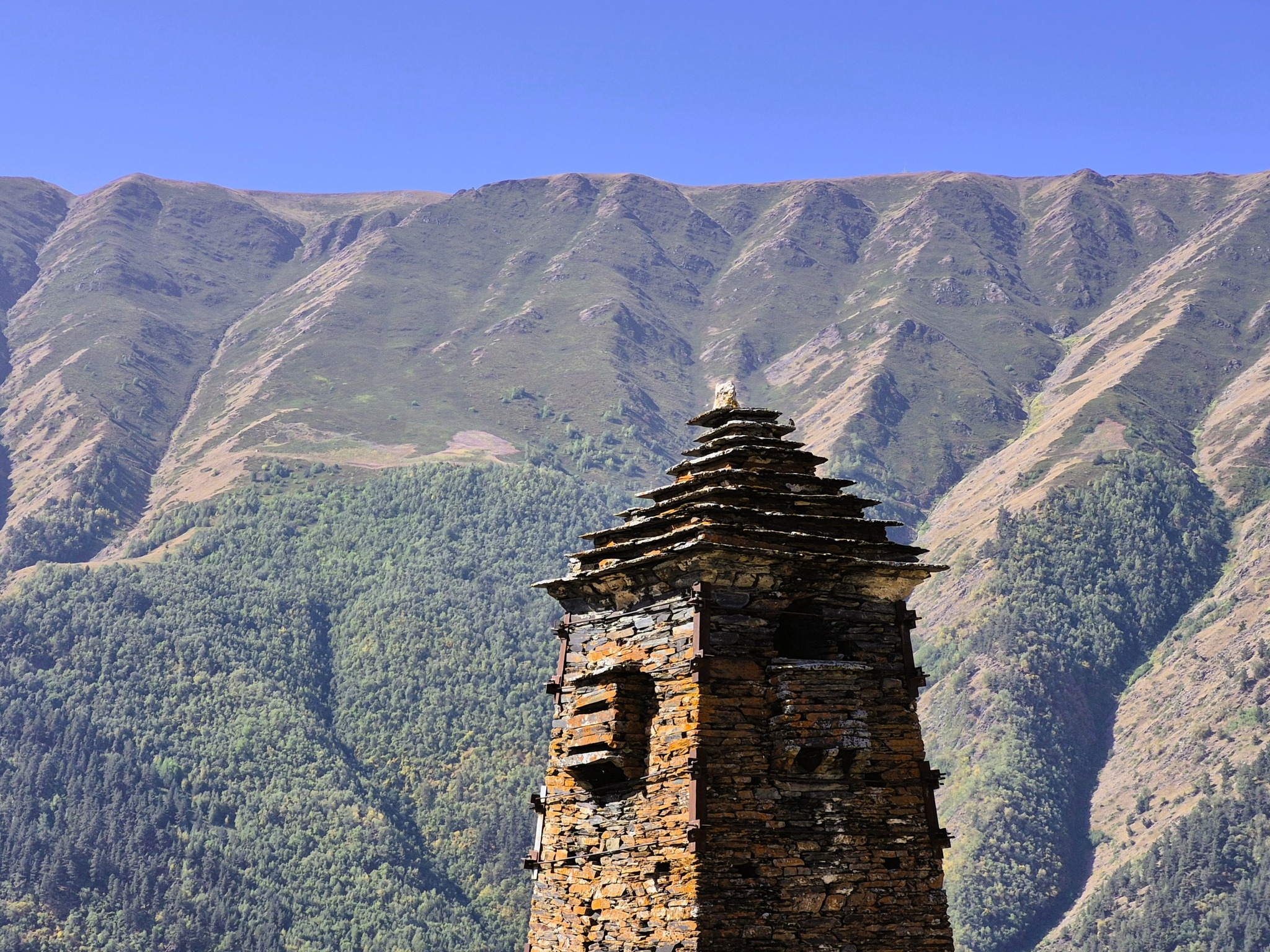 ביום הבא המשכתי במסע מערבה מעל הנהר היפה, עברתי בדרכי חמישה כפרים מסורתיים מיושבים ועוד כמה מצודות בודדות שנבנו על הגדה הצפונית של הפיריקיטיס, חלקם לצד הנהר ואחרים גבוה מעליו. מדרטלו טיפסתי דוך במעלה תלול לעבר המגדל המרשים של הכפר קבבלו (Kvavlo). קבי מתכת תומכים את צלעות המגדל ומקיפים אותו, שומרים על רוח חיים באפו בטרם יתמוטט מתישהו אל פי תהום. לבי לבי עם הפועלים שהקימו סביבו פיגומים, חיזקו ואימצו את המגדל הרעוע בעוד הבטן משקשקת להם מפחד.