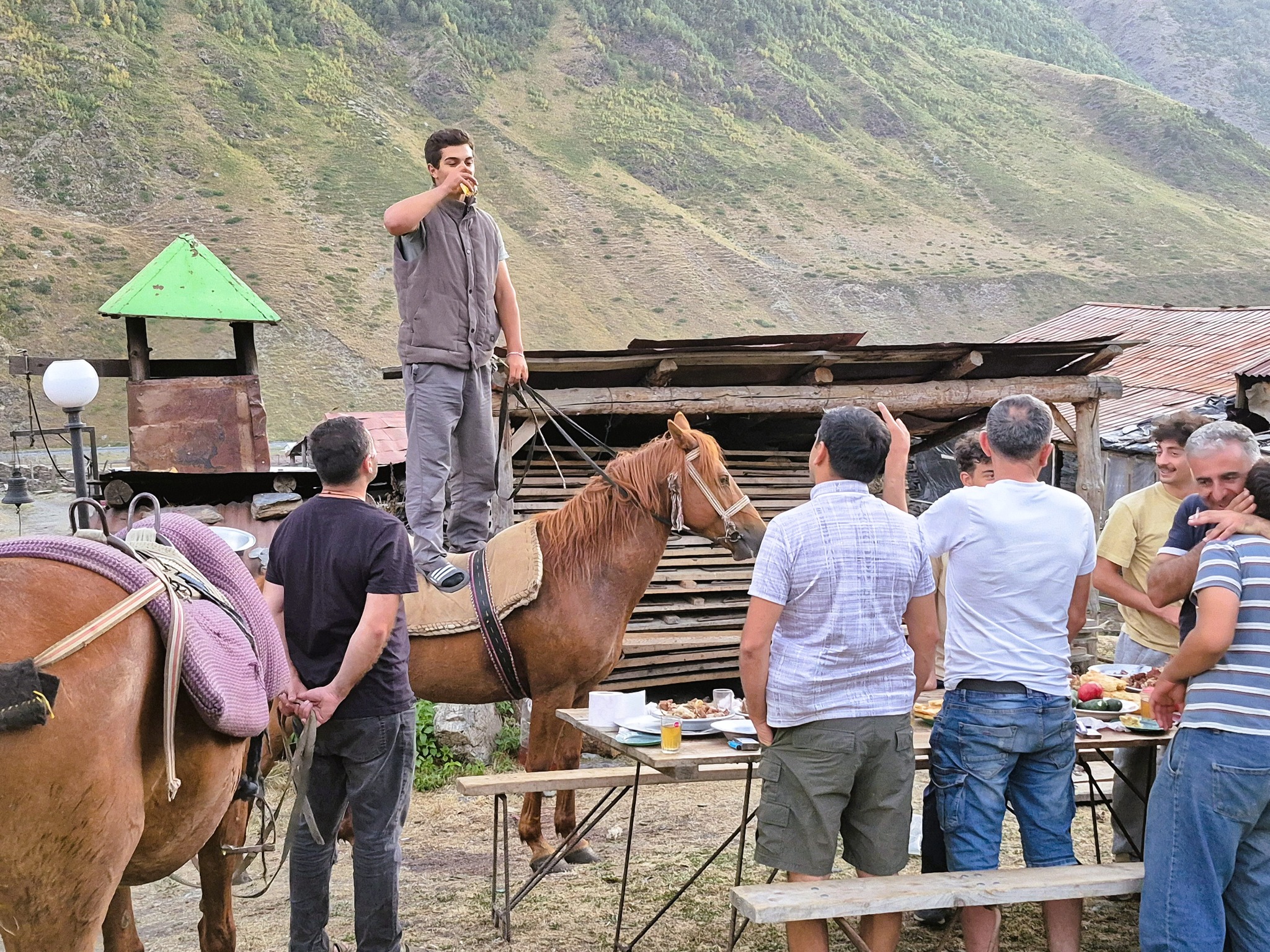 מולי ירד מן ההר בחור צעיר וחברותי אוחז במושכות של שני סוסים. שמו שיו, הוא דובר אנגלית והוא הבעלים של גסטהאוס הקרוי על שם סבא שלו, ששמו, ראו זה פלא, אף הוא שיו. כן, הוא יכול לבוא איתי עם שני הסוסים עד שתילי כבר מחר בבוקר, בסך הכל שלושה ימי הליכה. כן, הוא יארגן לי אוהל מזרון ושק שינה של אחותו הגדולה, ומה עם ציוד שהשארתי באומלו בתחילת הטרק? מסתבר שזה הגסטהאוס של דודתו והוא יתקשר אליה וידאג שהיא תשלח את זה לטביליסי. מדהים איך הפאזל הסתדר לי. כנראה עשיתי משהו טוב בחיים שלי.