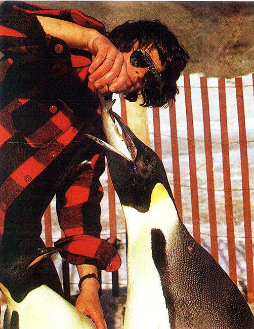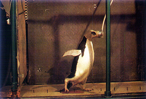 כבר שבוע ימים אנו מנסים להשיג תוצאות מהפינגווינים שלנו אך לשווא. התקנו את המיכשור, הבאינו את הפינגווינים ובכל פעם מצאנו משהו אחר שהפריע למחקר. כיוון שלא ידענו כיצד מתנהגים הפינגווינים וכיצד הם מגיבים, היה עלינו לשנות דברים רבים. הפינגווינים אינם מרתיעים, להיפך הם נחמדים ושקטים מאד ולעיתים מפליא עד כמה סובלניים הם. ברגע שאינם חשים שיש צורך בהגנה מפנינו אפשר לנהל עמם משא ומתן ללא בעיות – מצאנו דרך להביאם למעבדה – על ידי קופסא סגורה ומאווררת. הקטנו את קופסאת השקילה שלנו כך שאין הם יכולים להתרוצץ בה ולפצוע עצמם בנסיונות טיפוס. השקילה נעשית מהירה מיום ליום ואין צורך בארבעה אנשים כדי לשקול פינגווין אחד. נוח להכניסם לתא-מקרר ואילו "לדחוף" את המדחום לתוך ישבנם הסגור. הם הולכים שעות על הסרט הנע ואפילו "לדחוף" את המדחום לתוך ישבנם פניהם. |