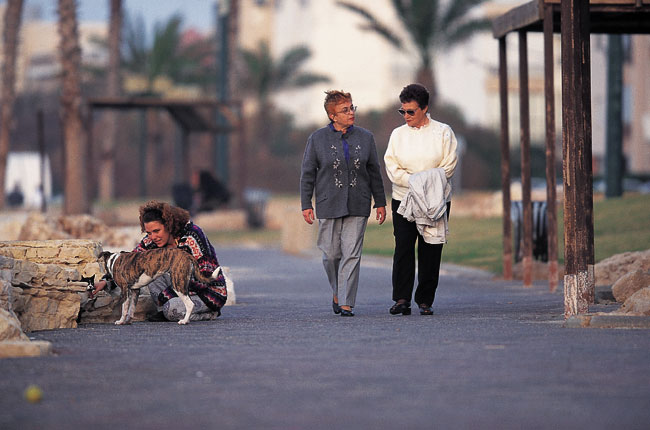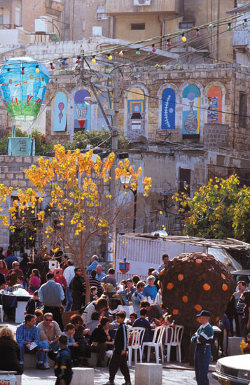 ההליכה היא בין חצרות המוקפות חומות וסגורות מאחורי שערי מתכת כבדים. פה ושם תגלו זרוע של גפן שנשלחת אל מעבר לחומה. כתובות הקיר בערבית: סיסמאות של מפלגות, וגם הכרזות אהבה נרגשות. מחלונות הבתים בוקעות צעקות של אימהות, הקוראות לילדיהן, ושומעים צלילים של מוזיקה ערבית.